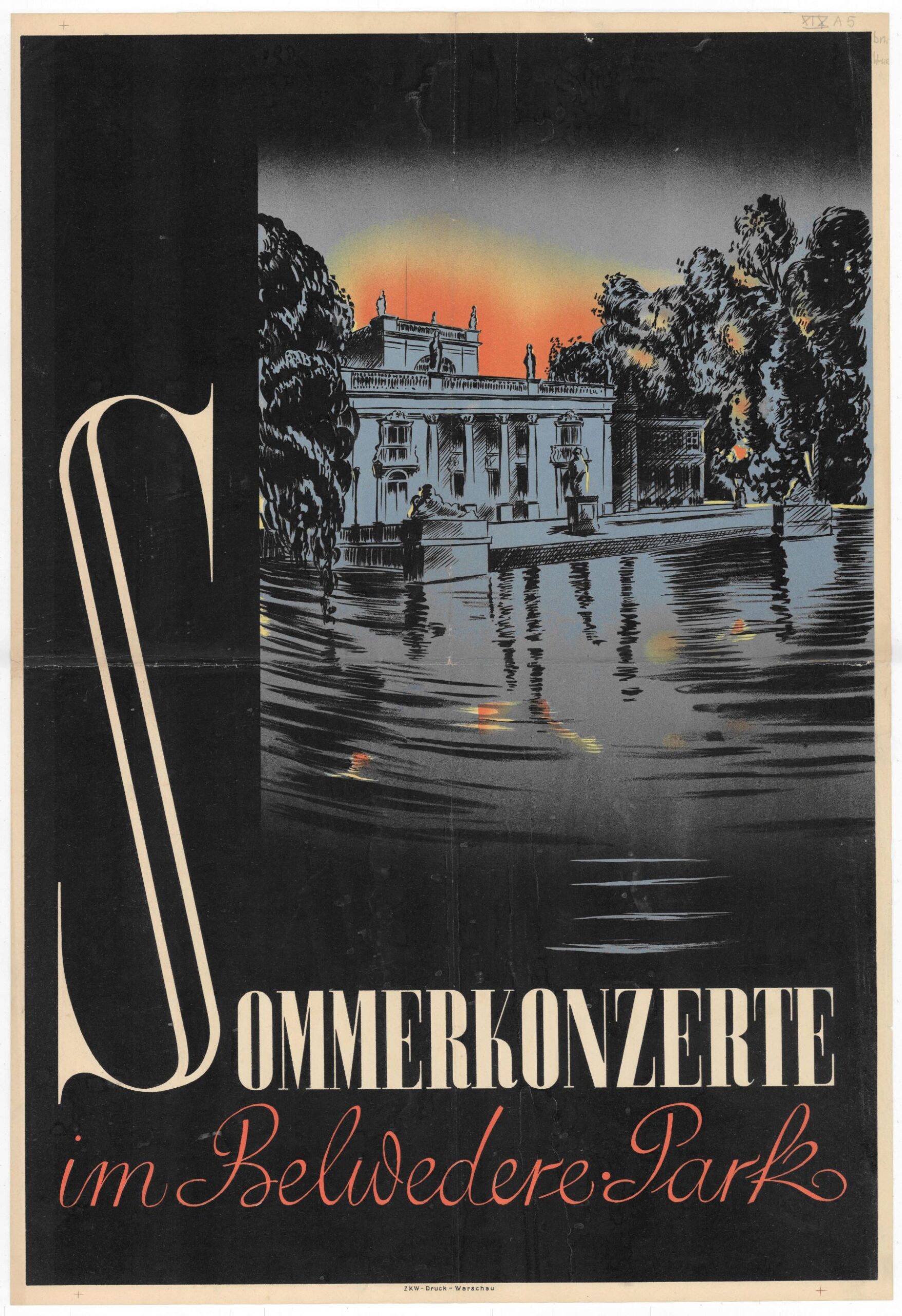 - Plakat promujący letnie koncerty w Łazienkach, przyłączonych w czasie okupacji do Belwederu i nazywanych przez Niemców Belvedere-Park, sierpień 1943, wytwórnia „NKW-Druck, Warschau”, w zbiorach Biblioteki Narodowej / Polona (sygn. DŻS XIXA 5).