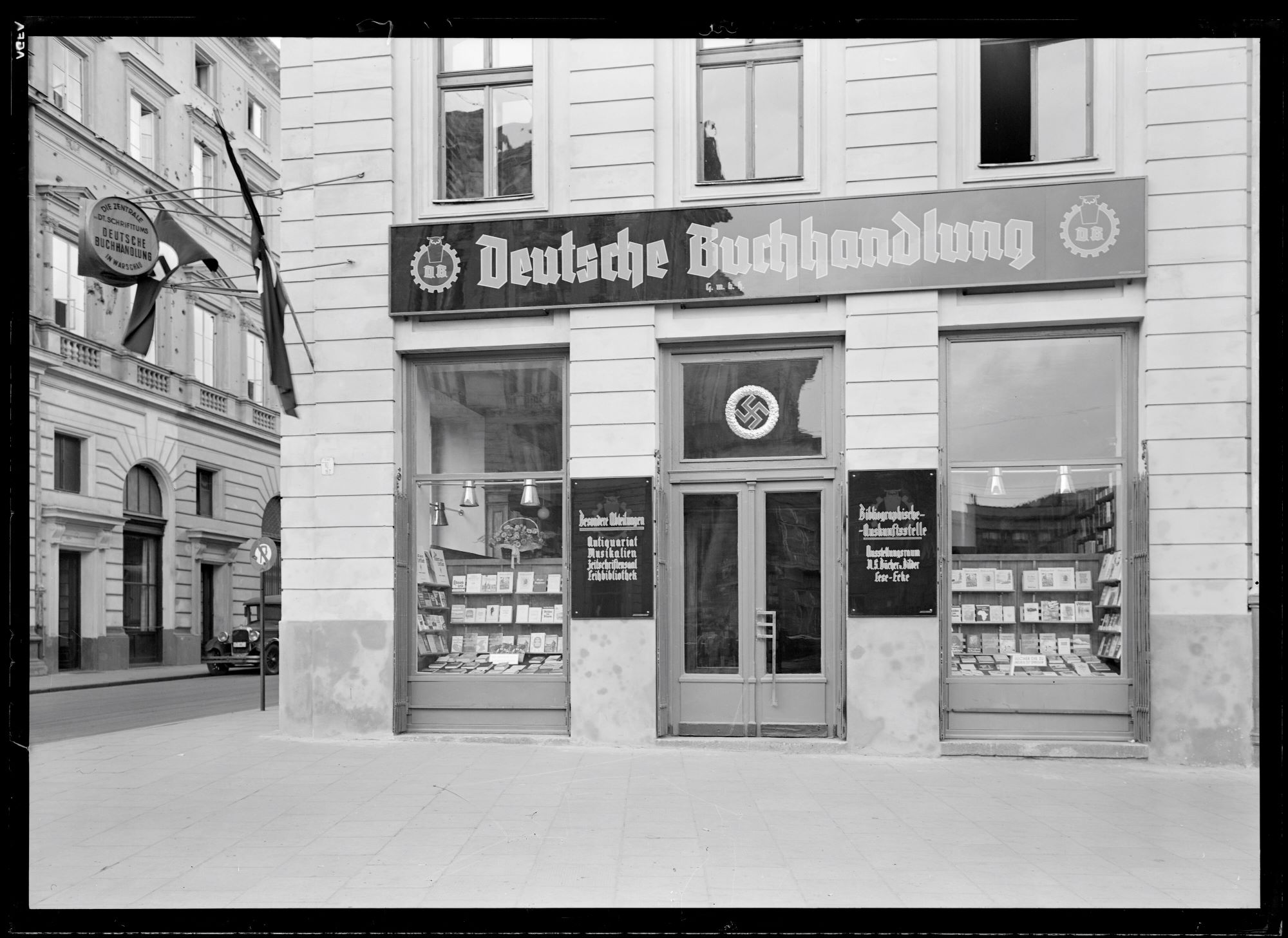 - Księgarnia firmy Deutsche Buchhandlung GmbH przy ul. Krakowskie Przedmieście 15, w miejscu przedwojennej księgarni firmy Gebethner i Wolff, 1940, fot. Henryk Poddębski, fotografia w zbiorach Muzeum Warszawy (sygn. AN 103465).