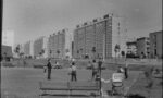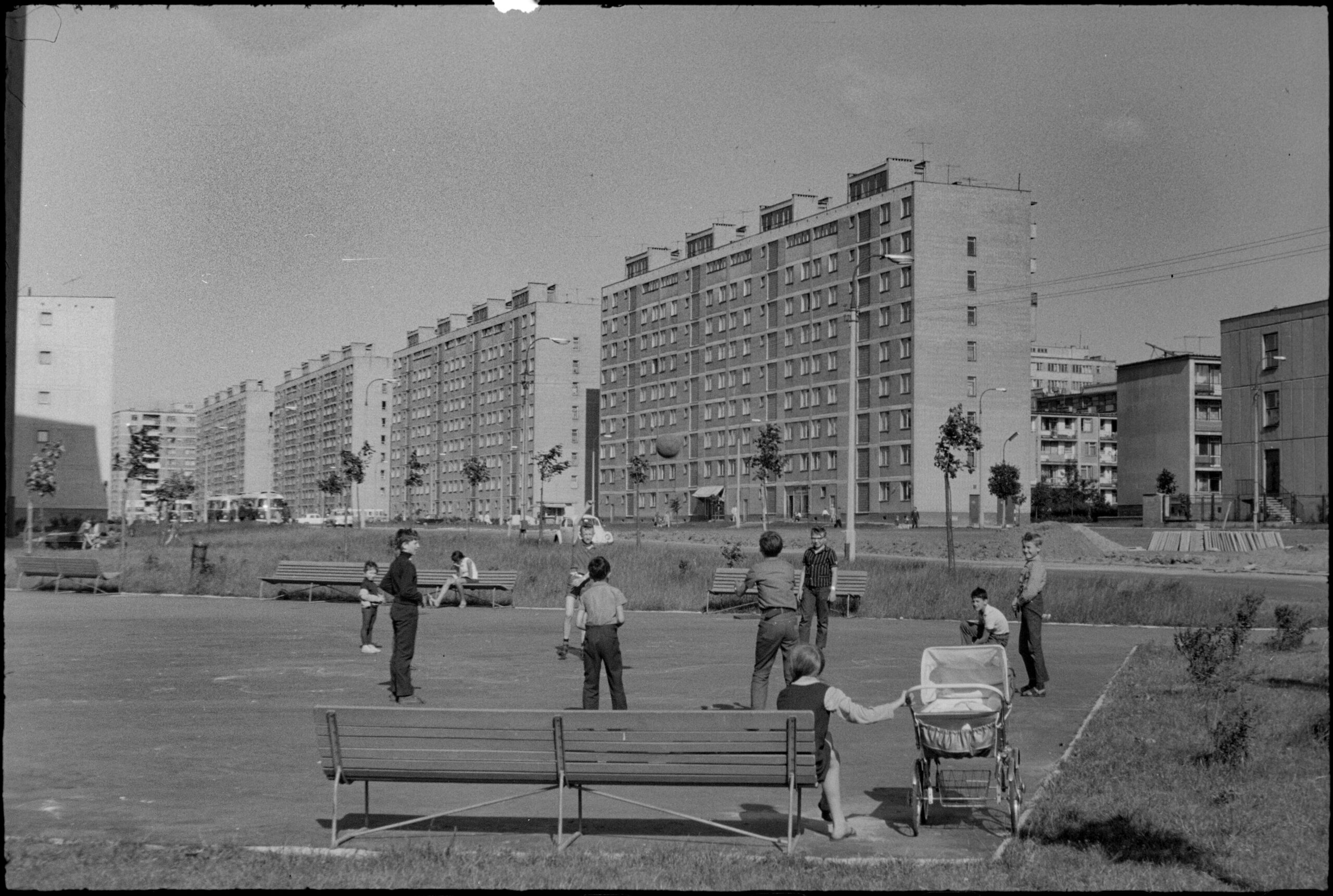 - Aleksander Minorski, Dzieci grające w piłkę na skwerze przy ulicy Mordechaja Anielewicza. Ujęcie w kierunku wschodnim. W tle ośmiopiętrowe bloki pod numerami 37, 35, 33 i 31, ok. 1970. Zbiory Muzeum Warszawy, AN 32915