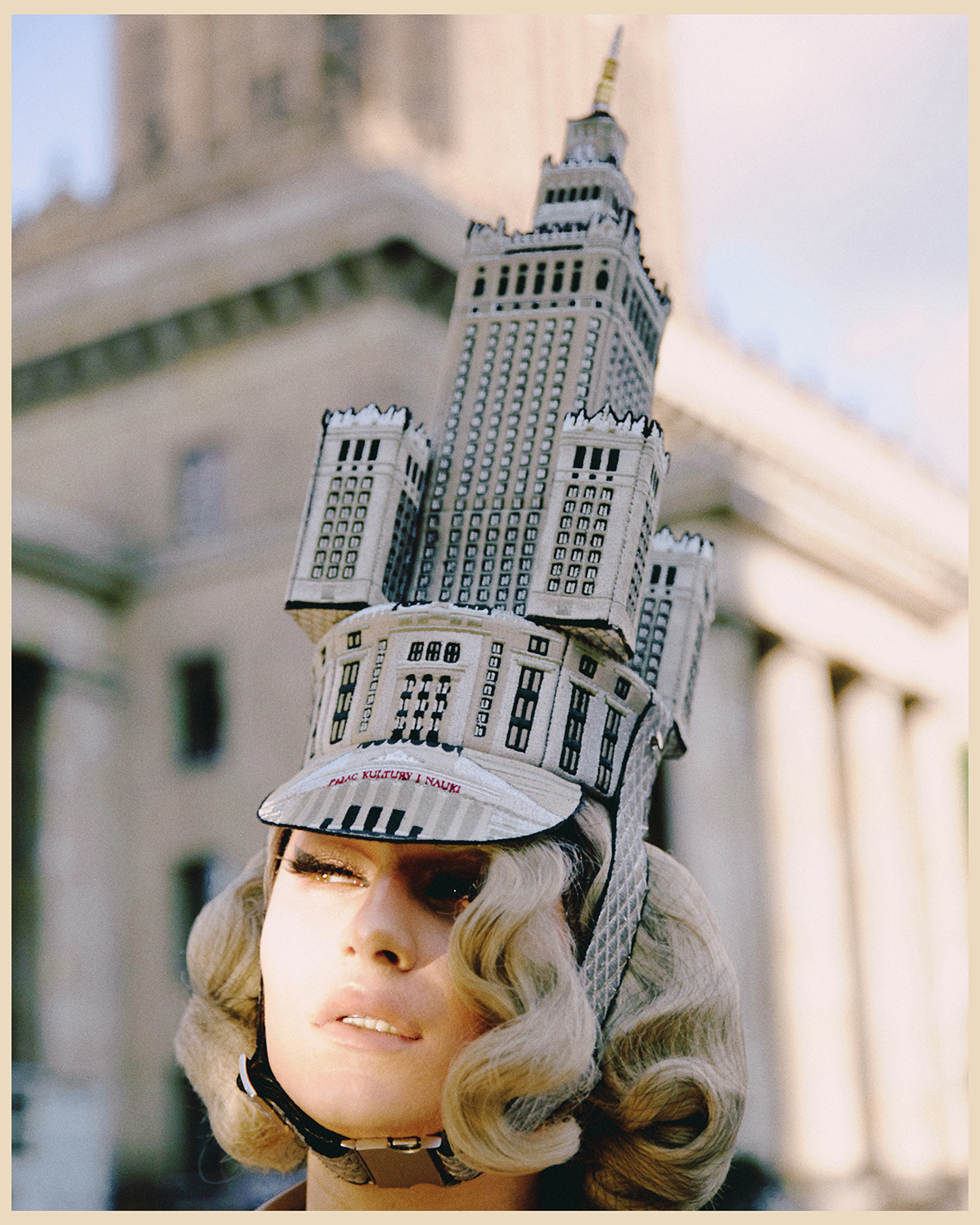 - RAD DUET Juliusz Rusin, Maciej Jóźwicki, Nakrycie głowy w kształcie PKiN, modelka Shady Lady, fot. Weronika Walijewska