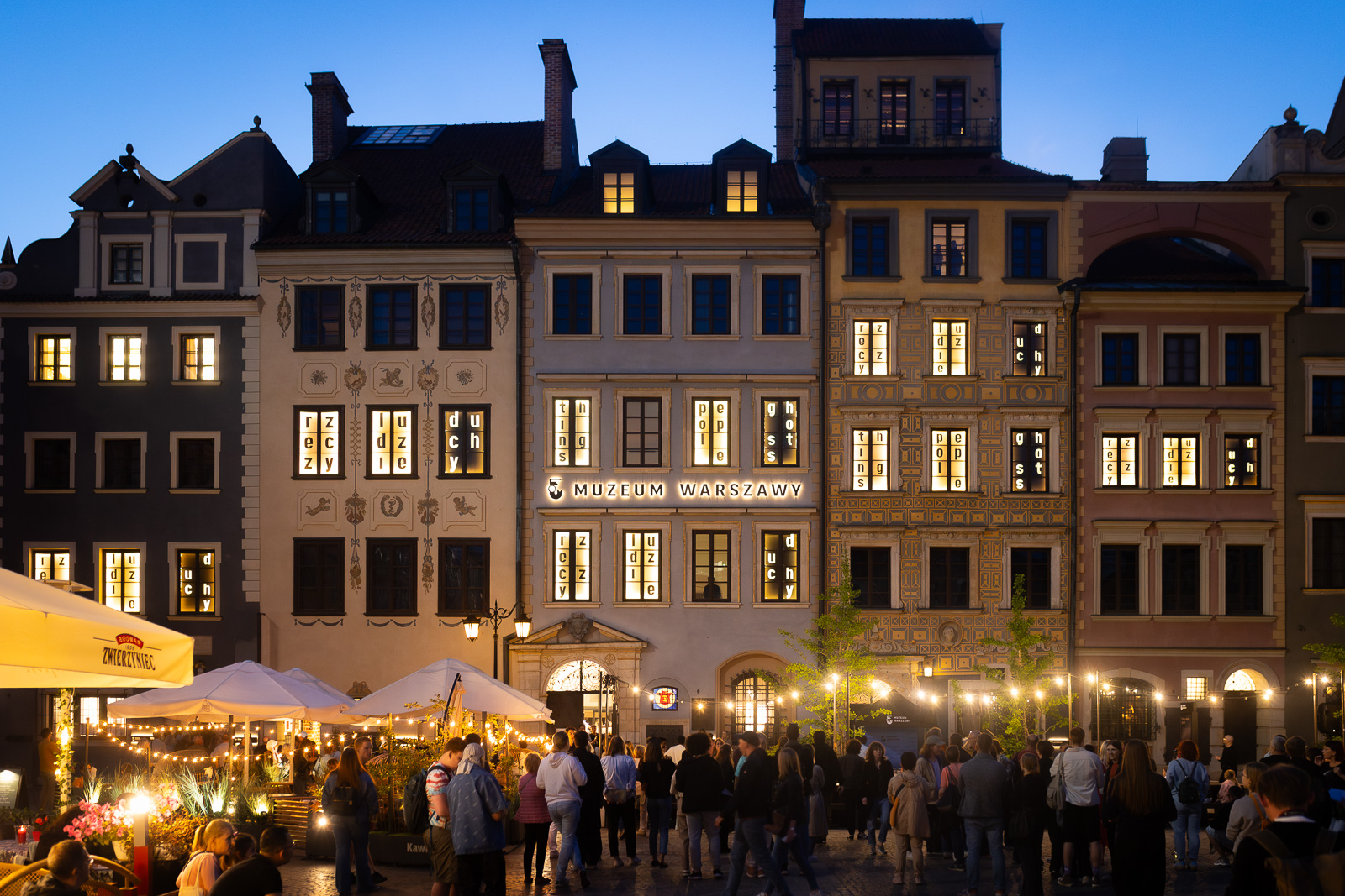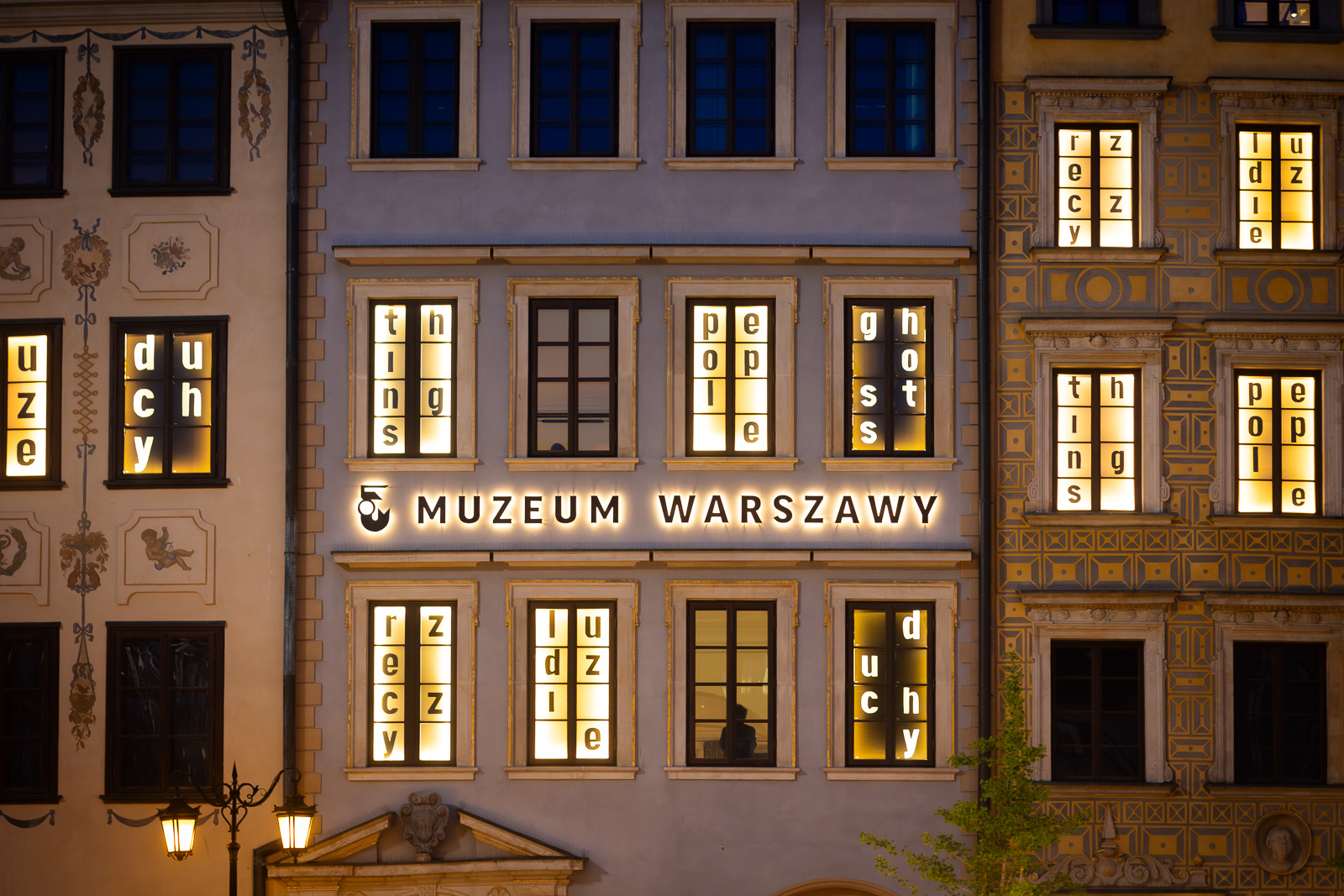 Interwencja artystyczna Jadwigi Sawickiej na fasadzie Muzeum Warszawy opiera się na trzech słowach: Rzeczy, ludzie, duchy i nawiązuje do wystawy głównej Muzeum Warszawy Rzeczy warszawskie.